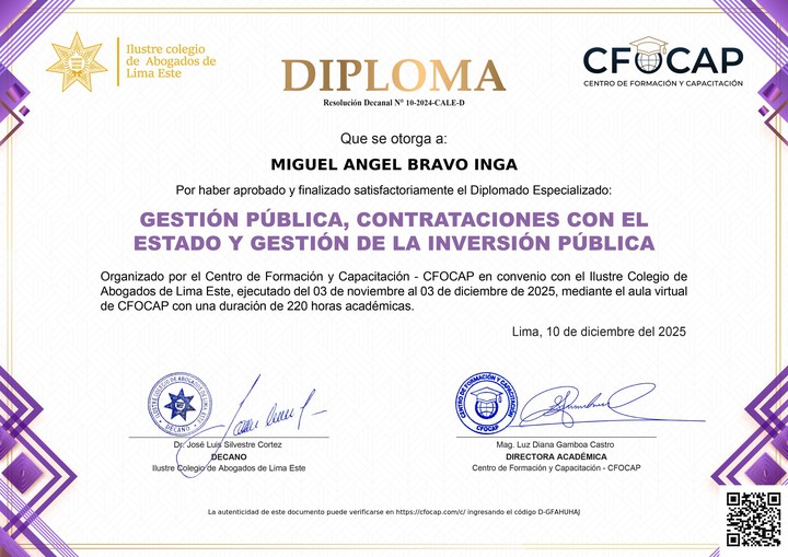 Diplomado: GESTIÓN PÚBLICA, CONTRATACIONES CON EL ESTADO Y GESTIÓN DE LA INVERSIÓN PÚBLICA a